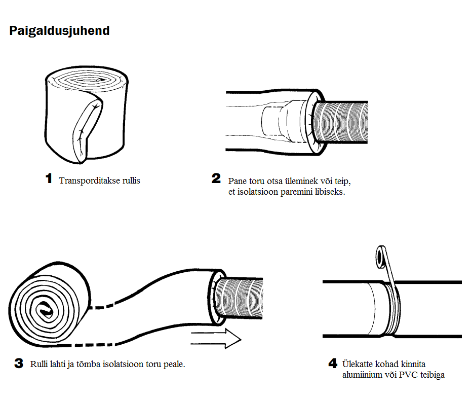 Ventilatsioonitoru otsa tuleb paigaldada üleminek või see teipida, et isolatsioon paremini torule peale libiseks. Seejärel rullitakse toode lahti ja tõmmatakse ventilatsioonitorule peale. Ühenduskohad tuleb kinnitada PVC või alumiinium teibiga.